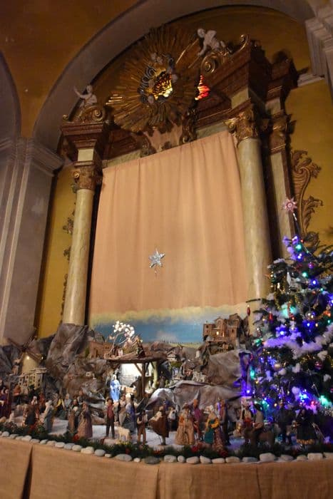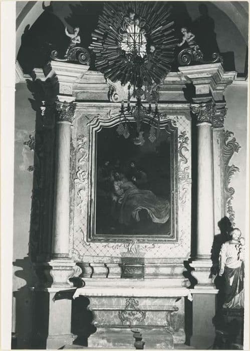 Autel, retable et sa toile. Gypseries et stucs polychromes et dorés. Grand retable à colonnes corinthiennes au fronton composé par une gloire rayonnante autour d'une lucarne (fenêtre), flanquée de deux volutes et de deux angelots.