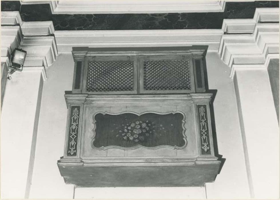 Deux loggias de tribune avec claire voie. Ces tribunes se présentent comme un balconnet de section rectangulaire dont la rambarde, en encorbellement possède trois faces. La face principale est décorée d'un médaillon rectangulaire à bords chantournés. La rambarde est surmontée d'une claire voie à deux volets rabattables. L'ensemble est peint en gris-vert, les panneaux sont décorés d'un bouquet de fleurs polychromes sur fond bleu foncé.