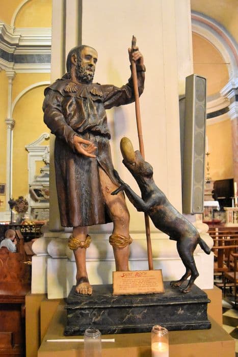 Le chien, hissé sur ses pattes de derrière, s'appuie sur la cuisse droite de saint Roch, présentant un pain rond dans sa gueule.