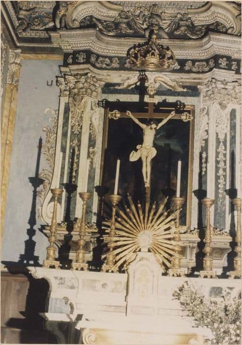 Maître-autel et son retable, marbres et gypseries polychromes et dorées. Grand autel à table-tombeau surmonté de trois degrés dont les bords sont ornés de consoles avec angelots en relief. Le tabernacle a été remanié au 19e siècle et percé d'une porte à arc brisé.