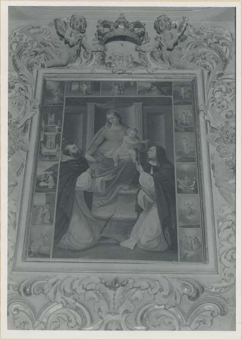 autel retable de la Vierge-du-Rosaire, tableau : l'Institution du rosaire entourée des quinze mystères
