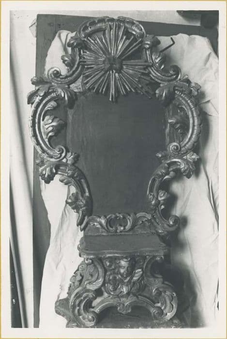 Exposition composée d'un socle semi-circulaire sur un soubassement polygonal, les contours sont rehaussés de frises (guirlande de feuilles, oves). Le fond est lyriforme (bords décorés de ramages fleuris et d'acanthes entourant un petit miroir circulaire rayonnant). Il est surmonté d'un petit dais à lambrequin.