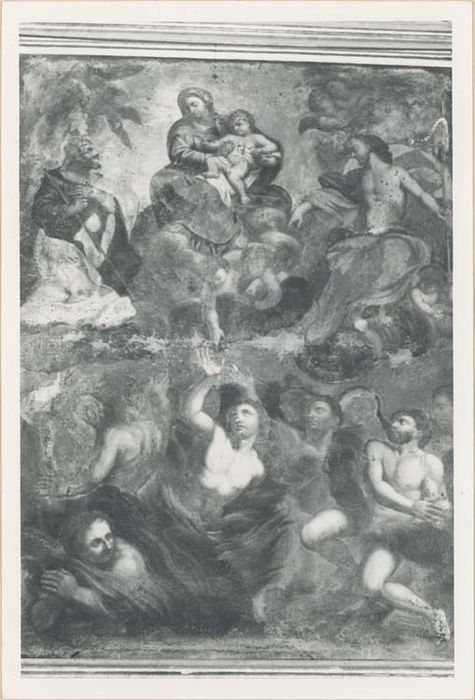 autel retable de la chapelle du Purgatoire, tableau : Saint Roch et saint Jean-Baptiste intercédant auprès de la Vierge à l'Enfant pour les Ames du Purgatoire