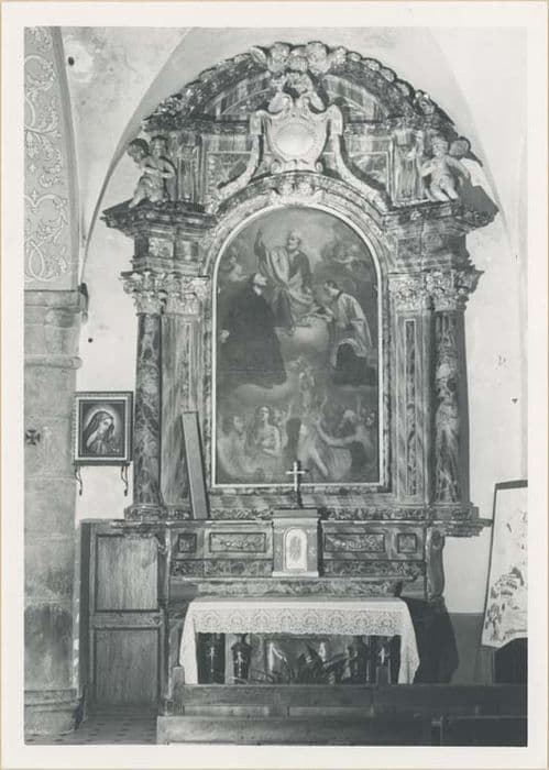 Autel et retable, gypseries polychromes et dorées, et sa toile. Table d'autel décorée de guirlandes sur la face et soutenue à l'avant par deux paires de colonnes tronconiques. L'autel est surmonté de deux gradins et d'un retable à colonnes et pilastres corinthiens. L'entablement, cintré en son milieu, s'inscrit dans un fronton en arc de cercle décoré de guirlandes et d'angelots.