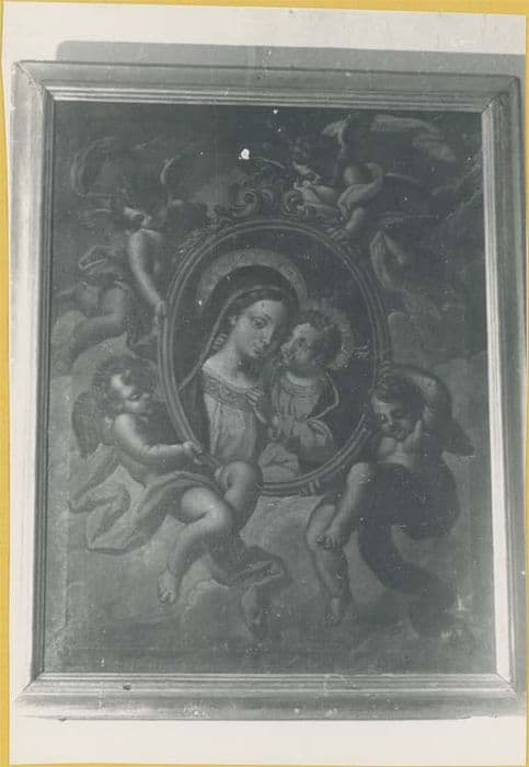 Vierge à l'Enfant, médaillon ovale tenu par deux anges : toile avec son cadre.