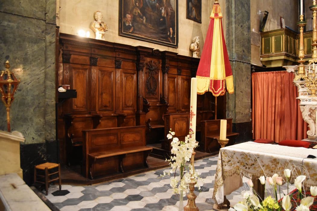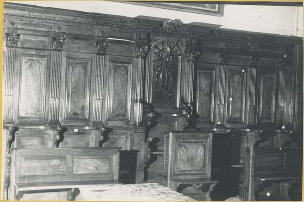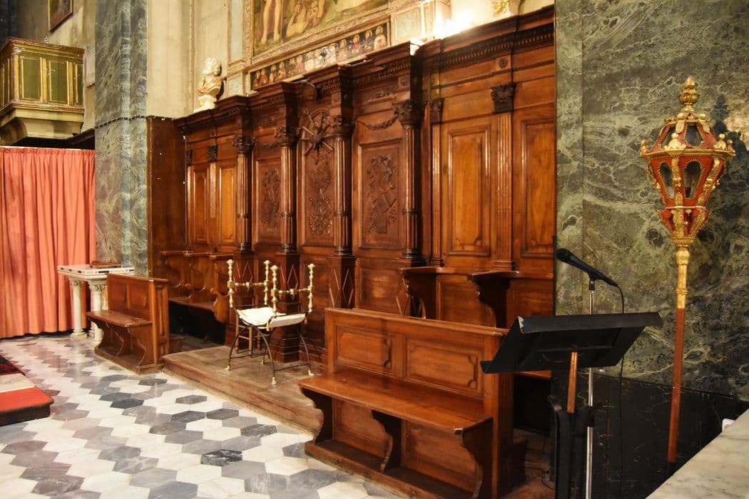 Stalles à lambris rythmés par des pilastres cannelés à chapiteaux corinthiens. Les stalles principales ont un dossier orné de sculptures en bas-relief.