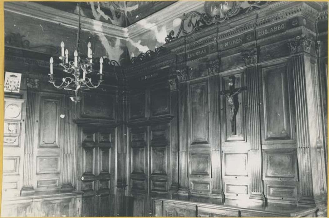 Boiseries de la sacristie. Boiseries couvrant toute la sacristie. Conception architecturale d'une façade. Côté Est, un avant-corps central orné d'un crucifix. Décoration architecturale rythmée par des pilastres cannelés à chapiteaux composites, soutenant un entablement orné de denticules et d'oves et surmonté d'un bandeau plat sculpté de deux palmettes. Côté Ouest : l'avant-corps possède deux portes dérobées permettant l'accès aux orgues et aux parties basses de l'église. Chaque élément possède des portes abattantes s'ouvrant vers le haut.