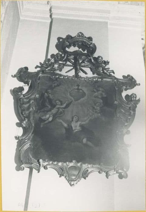 Encadrements de style rocaille, de section triangulaire à bords et angles arrondis, décorés de motifs coquilliers et volutes. Deux anges tenant une couronne surmontant l'emblème de l'Esprit Saint (colombe) constituent le sommet du fronton ce ces encadrements.