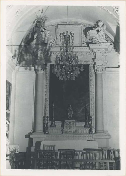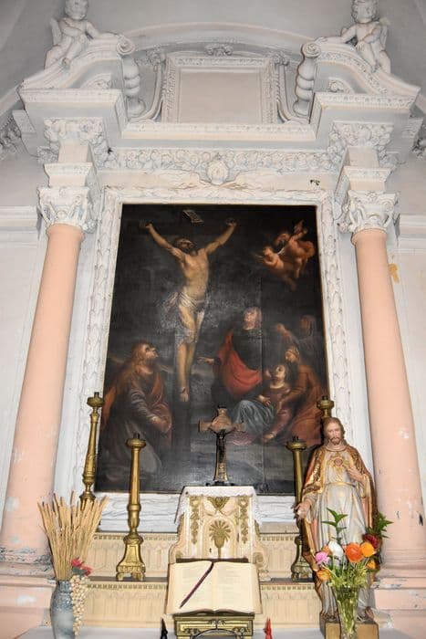 Autel et retable de la chapelle de la Crucifixion, gypseries, et sa toile, huile sur toile, fin du 17e siècle. Retable à colonnes surmontées de chapiteaux ioniques, agrémentés de motifs végétaux et surmonté d'un fronton brisé à voutes avec statuettes d'angelots.