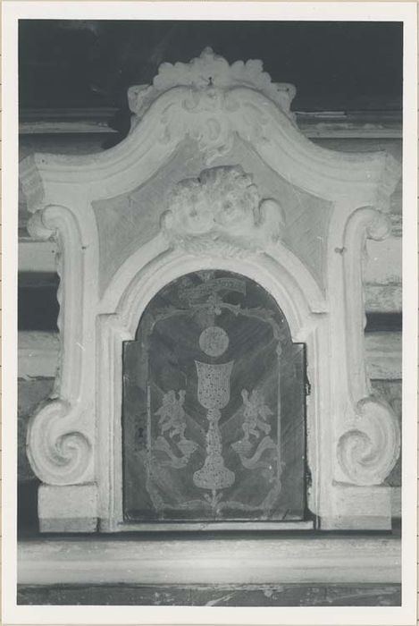 Autel, retable avec sa toile, gypseries polychromes. Autel tombeau à faces trapézoïdales ornées de motifs de gypseries. Le retable se limite à l'encadrement de la toile, cintré et surmonté d'un fronton à volutes et coquilles avec deux angelots, intégrant la fenêtre rectangulaire. Tabernacle orné de volutes et motifs coquilliers avec porte à décor de marqueterie de bois (calice et anges).