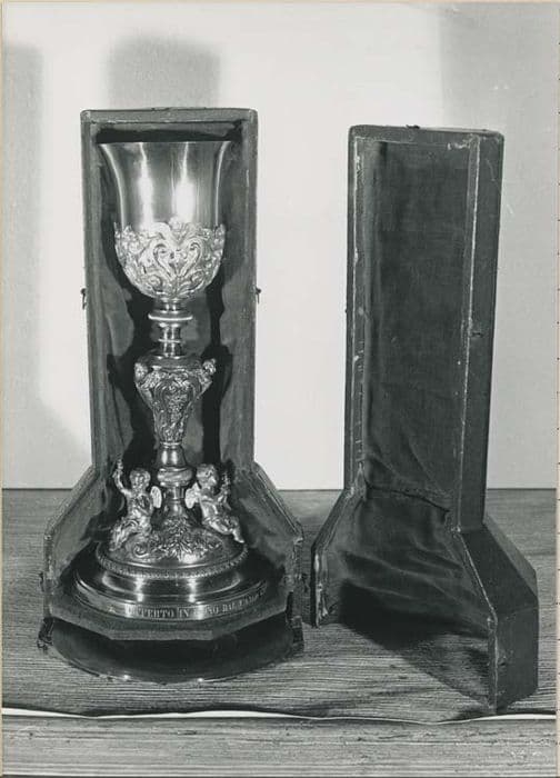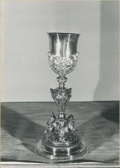 Calice à haut piédouche circulaire de forme hémisphérique portant trois angelots assis, brandissant des instruments de la Passion. Décor de rinceaux. Noeud en balustre décoré de thèmes végétaux (grappes de raisin, épis de blé). Timbale tulipe à gaine ajourée ornée de volutes, d'acanthes et de têtes de chérubins. Etui d'origine en cuir-carton doublé de satin. Le pied est doublé par une coupe ornée en son centre d'une rosace (patène).