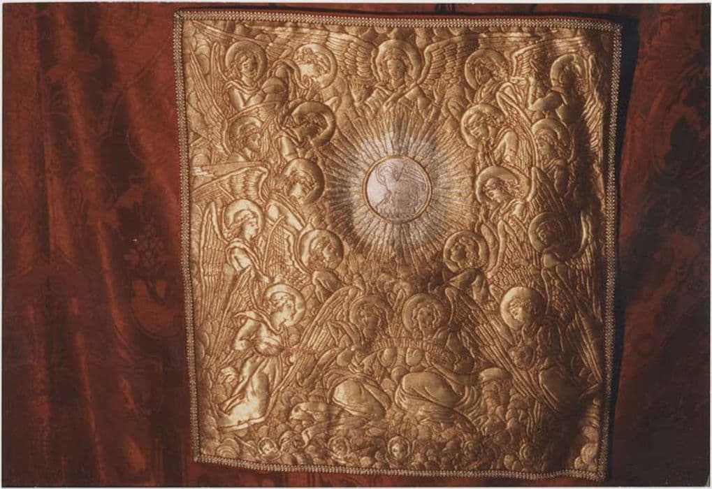 Chasuble avec ses accessoires (quatre pièces). Broché de soie rouge et or. Chasuble romane ou violons ornée au dos d'une croix dans laquelle figure la Sainte Trinité et la Vierge Immaculée entourée d'anges laudateurs ou musiciens. De l'autre face : bandeau central avec Vierge à l'Enfant dans une mandorle, entourée d'anges laudateurs et musiciens. Sur le voile, les mêmes anges entourent l'Agnus Dei rayonnant dans une réserve circulaire. Doublure taffetas rouge.