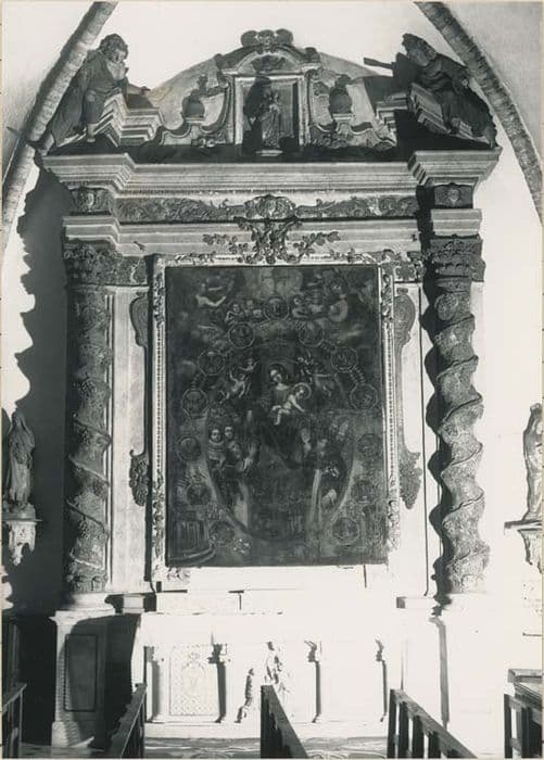 Treize mystères en tout, figurant dans des médaillons octogonaux fixé à un Rosaire à double rangée de perles entourant le médaillon central. Deux médaillons ont peut-être disparu dans la partie inférieure, lors d'un réajustement de la toile dans son encadrement au 17e siècle.