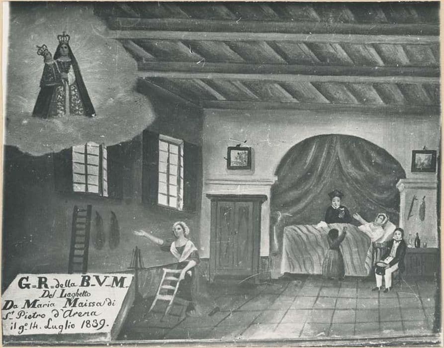 Inventaire n°21. Ex-voto tableau (fonctions combinées). Chambre de malade, une jeune fille est allongée dans le lit assistée de sa mère qui lui tient le poignet. Vierge de Laghet en haut à gauche (en fait une Vierge à l'Enfant quelconque).