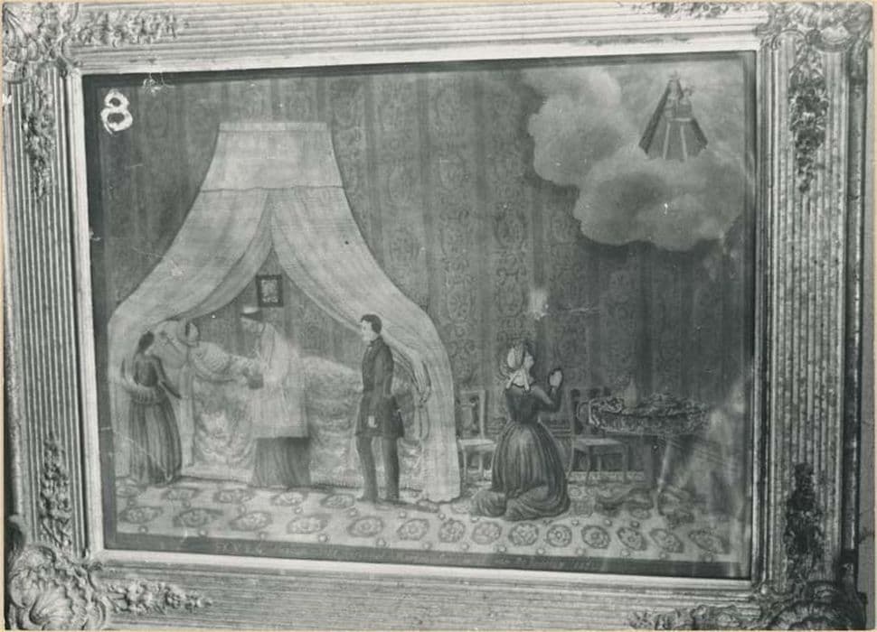 Inventaire n°43. Ex-voto tableau (fonctions combinées). Une chambre avec grand lit à baldaquin vide. A gauche, une femme (costume populaire) est à genoux près d'un berceau, à droite, une autre femme et un homme prient à genoux Notre-Dame de Laghet qui apparait en haut à droite.