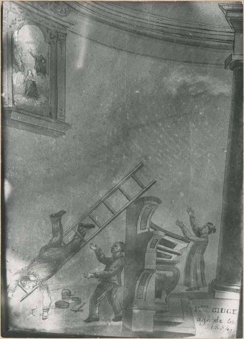 tableau ex-voto : Homme tombant d'une échelle dans une église