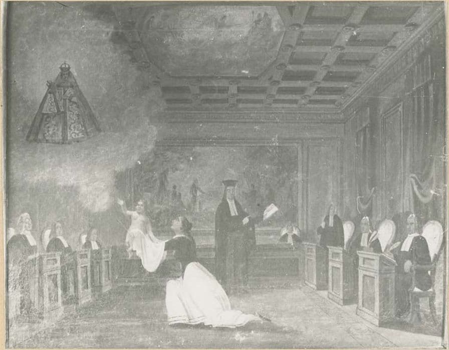tableau ex-voto : Reconnaissance d'un enfant devant le tribunal