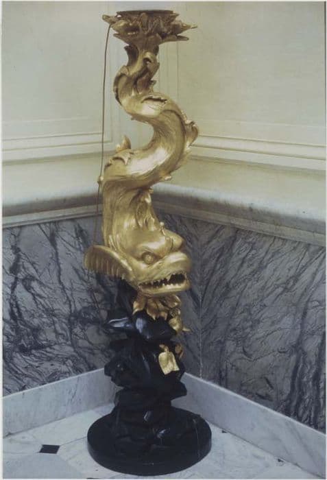 Trois paires de torchères en bois sculpté, doré et laqué, à motif de dauphin.