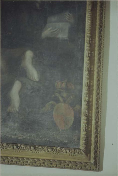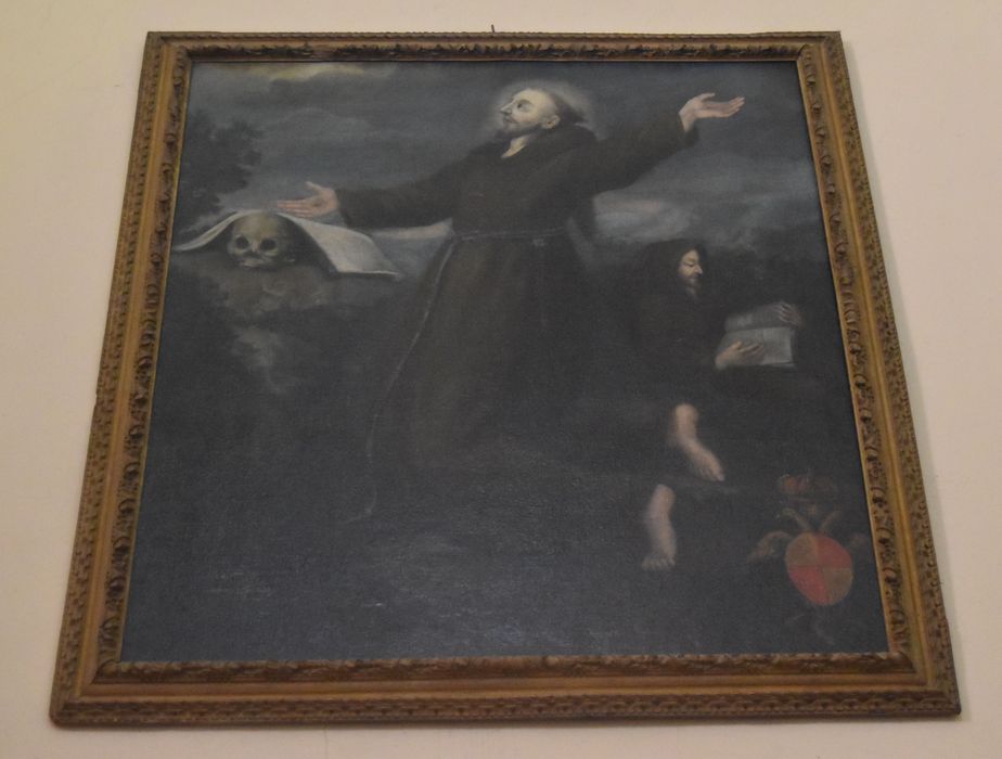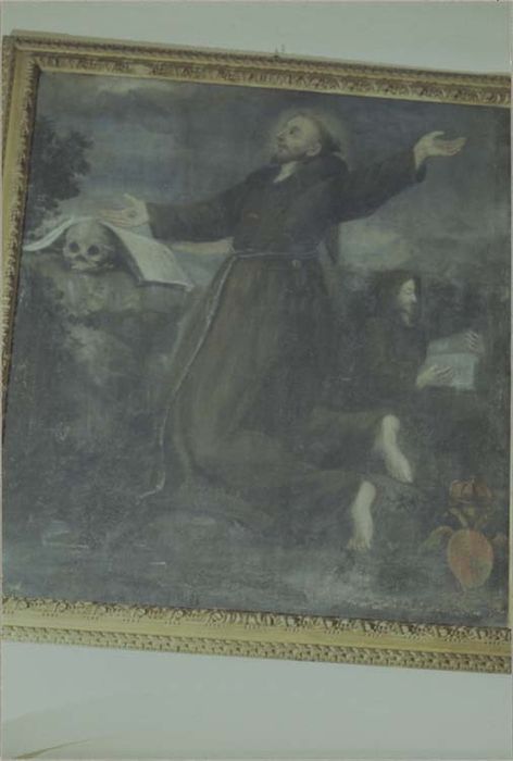 Arrêté : Tableau et son cadre : 'saint François d'Assise recevant les stigmates', huile sur toile, cadre de bois, XVIIIe siècle. H. 170 ; La. 136 cm. Les armoiries des Lascaris-Vintimille, co-seigneurs de Castellar, figurent en bas à droite du tableau.