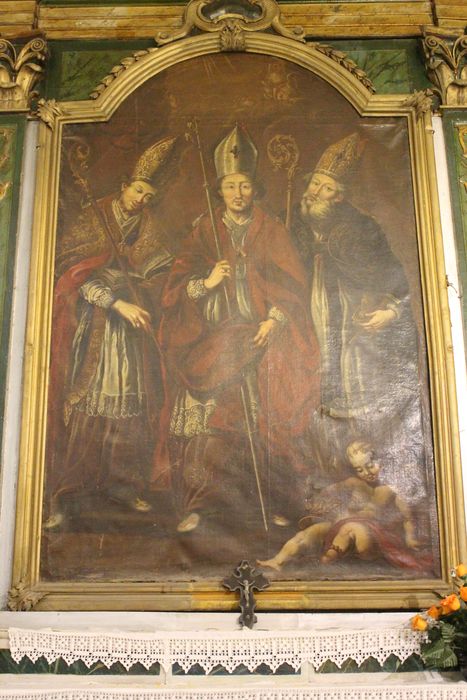 Arrêté : Retable et autel : tableau 'Saint Pons, saint Claude et saint Eloi', huile sur toile, encadrement en bois peint, XVIIe siècle.