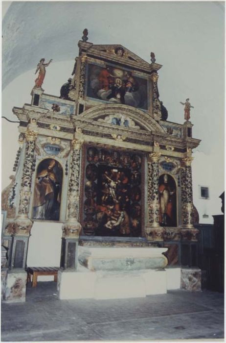 Arrêté : Autel de la chapelle avec son retable à colonnes et ses quatre tableaux : 'descente de Croix' avec 13 scènes de la Passion, 'saint Blaise', 'saint François de Sales', 'couronnement de la Vierge par la Sainte-Trinité', bois polychrome et doré, huile sur toile, XVIIe siècle. Dimensions : H. 680 ; La. 623 ; Pr. 120 cm. avec le cadre. Sur le tableau 'Descente de Croix avec 13 scènes de la Passion', il est inscrit en bas à gauche 'P.1665.R.P.1790' Dimensions : H. 256 ; La. 190 cm. Les 2 toiles 'saint Blaise' et 'saint François de Sales' mesurent H. 170 ; La. 80 cm. Le 'Couronnement de la Vierge par la Sainte-Trinité' mesure H. 120 ; La. 200 cm.