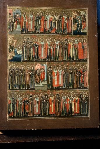 calendrier liturgique : six icônes figurant les saints de chacun des six premiers mois de l'année (de janvier à juin)