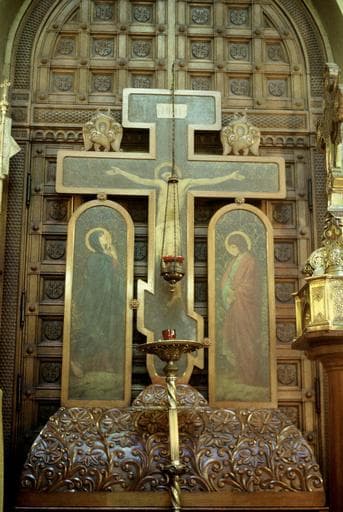 icône : Golgotha, le Christ en croix entre la Mère de Dieu et saint Jean le Théologien ou l'Evangéliste ou Crucifixion