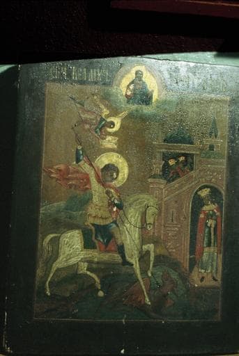 icône : saint Georges le Victorieux, représenté avec le Sauveur et un ange tenant une couronne sur sa tête