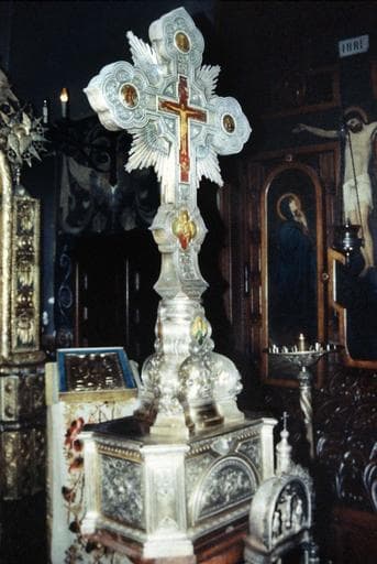 POP | Plateforme ouverte du patrimoinegrande croix de la table de commémoration des défunts avec son socle et la niche-tabernacle à tiroir mobile avec encensoir et figuration de la Crucifixion