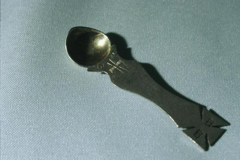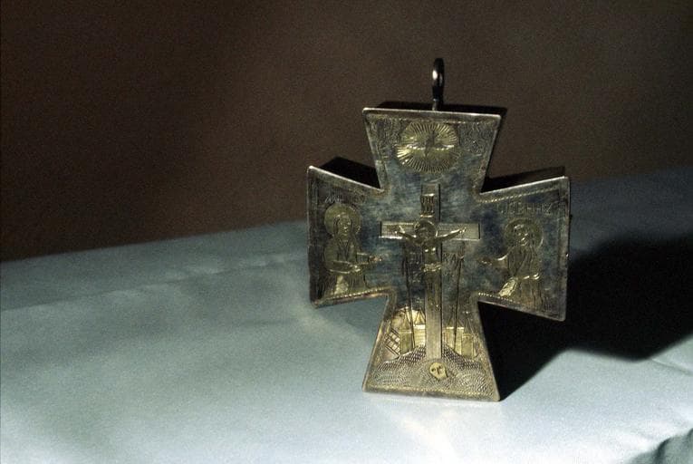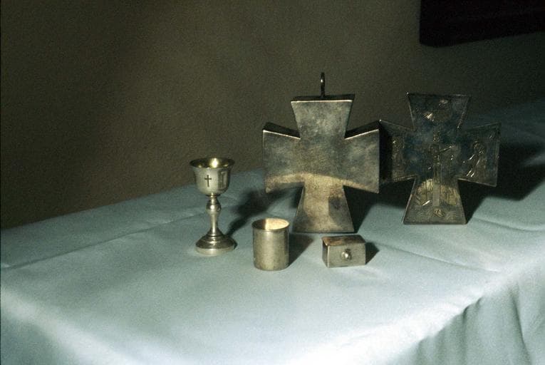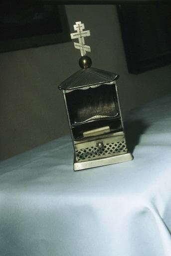 Argent, motifs ciselés. Tabernacle en argent en forme de sarcophage. Encensoir de voyage en argent.