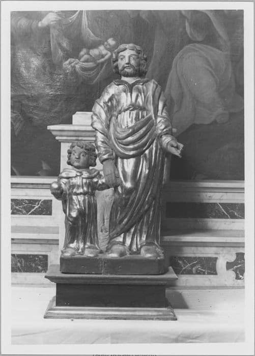 Saint Joseph est représenté en pied vêtu d'une tunique longue et d'un drapé. Il tient l'Enfant de sa main droite et tenait dans l'autre main un bâton, disparu. L'Enfant, vêtu de même, tient son père de sa main gauche et tient dans la main droite, un tout petit globe.