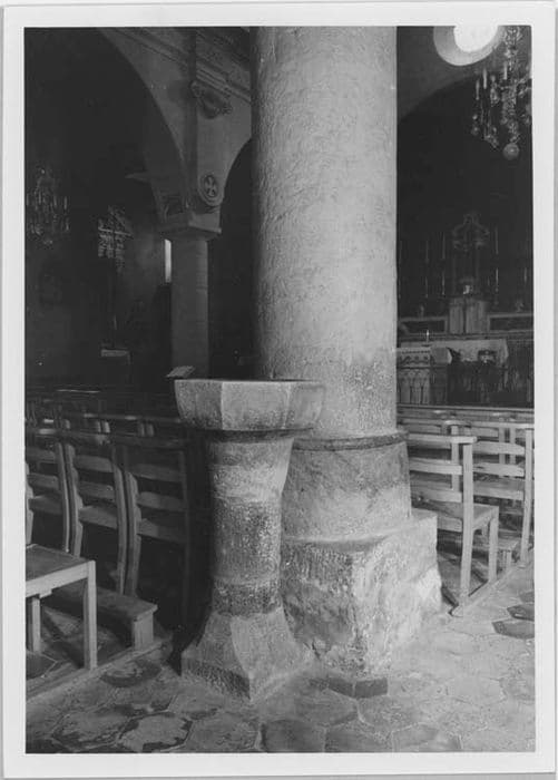 Petite cuve polygonale reposant sur un pied relativement trapu qui serait peut-être un remploi de colonne.