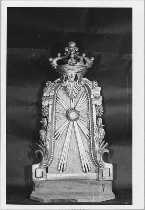 Cette exposition est ornée d'une gloire, de pampres de vignes, d'épis de blé et surmontée d'une couronne. Sur le fond est tendu un drap d'argent.