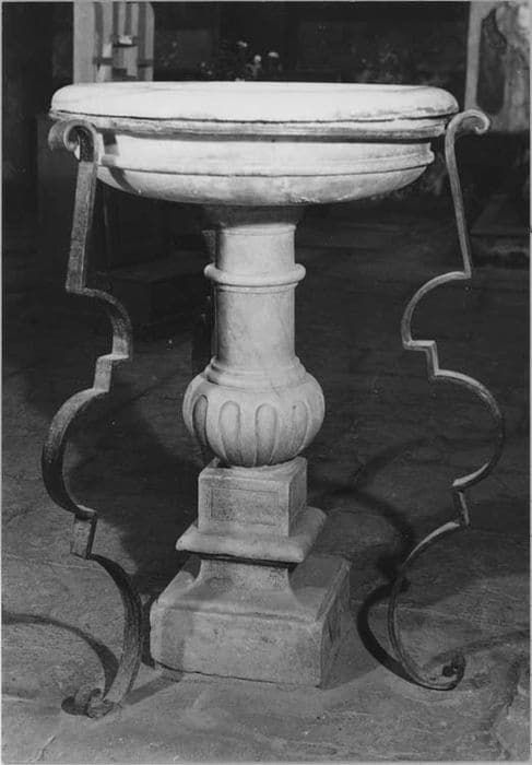 Bénitier composé d'une vasque reposant sur un pied en balustre qui lui-même repose sur un socle quadrangulaire. Ce support est étayé par un cerclage en fer forgé reposant sur trois pieds de biche.