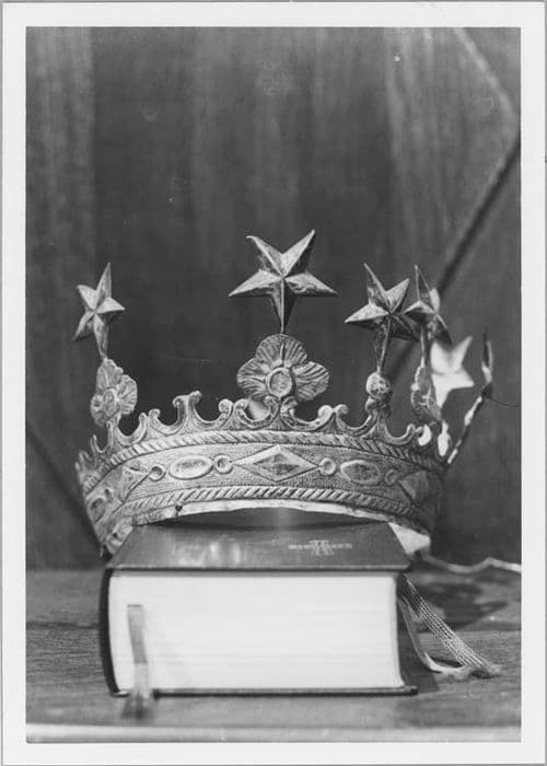 Cette couronne était sans doute destinée à une statue de Vierge. Elle présente une frise de losanges alternés avec des médaillons ovoïdes surmontée d'une rangée de feuillages stylisés et enfin de fleurs portant une étoile à cinq branches.