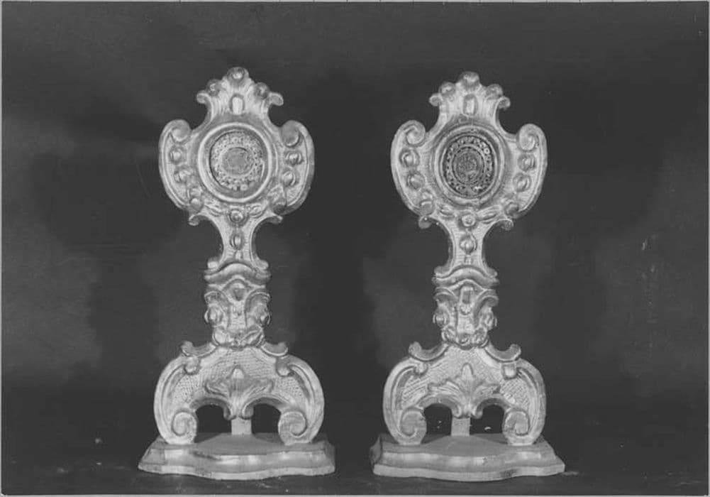 Ces reliquaires sont tripodes ; les reliques sont présentés dans des vitrines de forme ovoïde. Décor de volutes, guirlandes et coquilles en relief sur un fond quadrillé, le tout doré