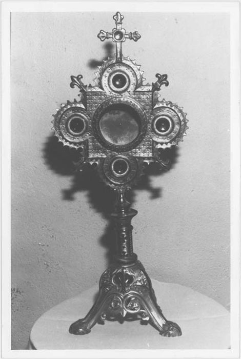 Reliquaire à socle pyramidal tripode, aux arêtes bombées, décoré de motifs végétaux. Tige cylindrique décorée d'étoiles et de croix. La monstrance est circulaire et présentée dans une réserve carrée, flanquée sur chaque côté de lobes à cabochons de verre. Entre les lobes, des fleurs de lys et une croix sommitale.