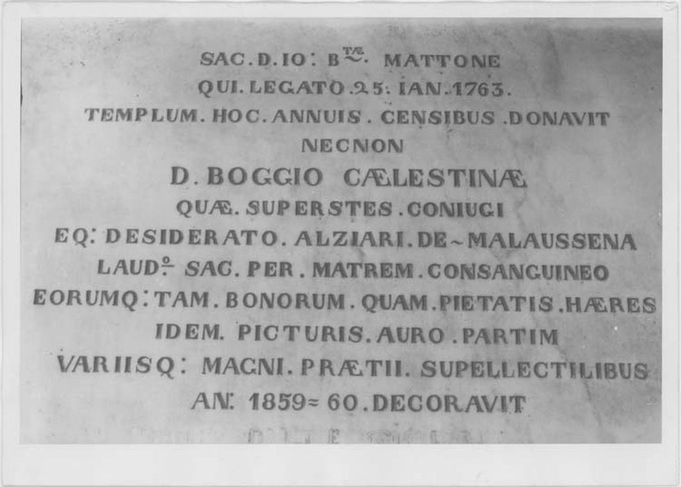 SAC. D.IO / BTAE. MATTONE QUI. LEGATO. 25: IAN. 1763. TEMPLUM. HOC. ANNUIS. CENSIBUS. DONAVIT NECNON D. BOGGIO CAELESTINAE QUAE. SUPERSTES. CONIUGI EQ: DESIDERATO. ALZIARI. DE - MALAUSSENA LAUD°. SAC. PER. MATREM. CONSANGUINEO EORUMQ: TAM. BONORUM. QUAM. PIETATIS. HAERES IDEM. PICTURIS. AURO. PARTIM VARIISQ: MAGNI. PRAETII. SUPELLECTILIBUS AN: 1859-60. DECORAVIT