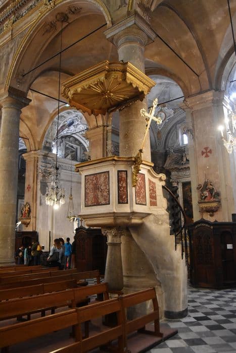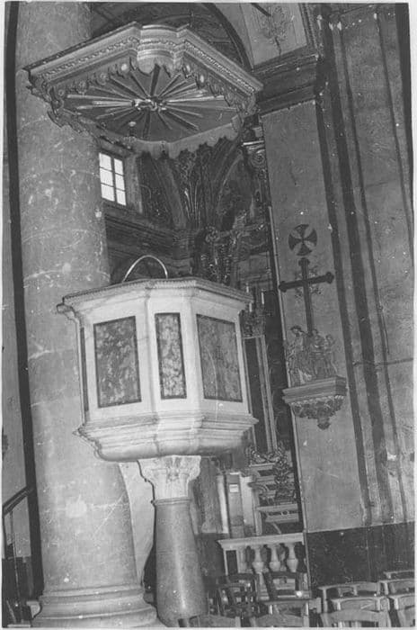 Chaire adossée à la première colonne de la nef centrale. Colonne en porphyre (Toscane) à chapiteau composite, montée sur stylobate, datée sur la base. Cuve rectangulaire à pans coupés en marbre blanc et polychrome sur entablement mouluré. Abat-voix en bois doré avec colombe du saint Esprit et gloire.