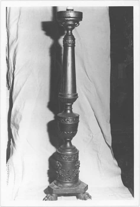 Chandeliers reposant une base triangulaire et trois petits pieds en pattes de lion. La base, cylindrique, est ornée d'une guirlande de fleurs attachée par des rubans. Le fût émerge d'un vase avec des feuilles stylisées.