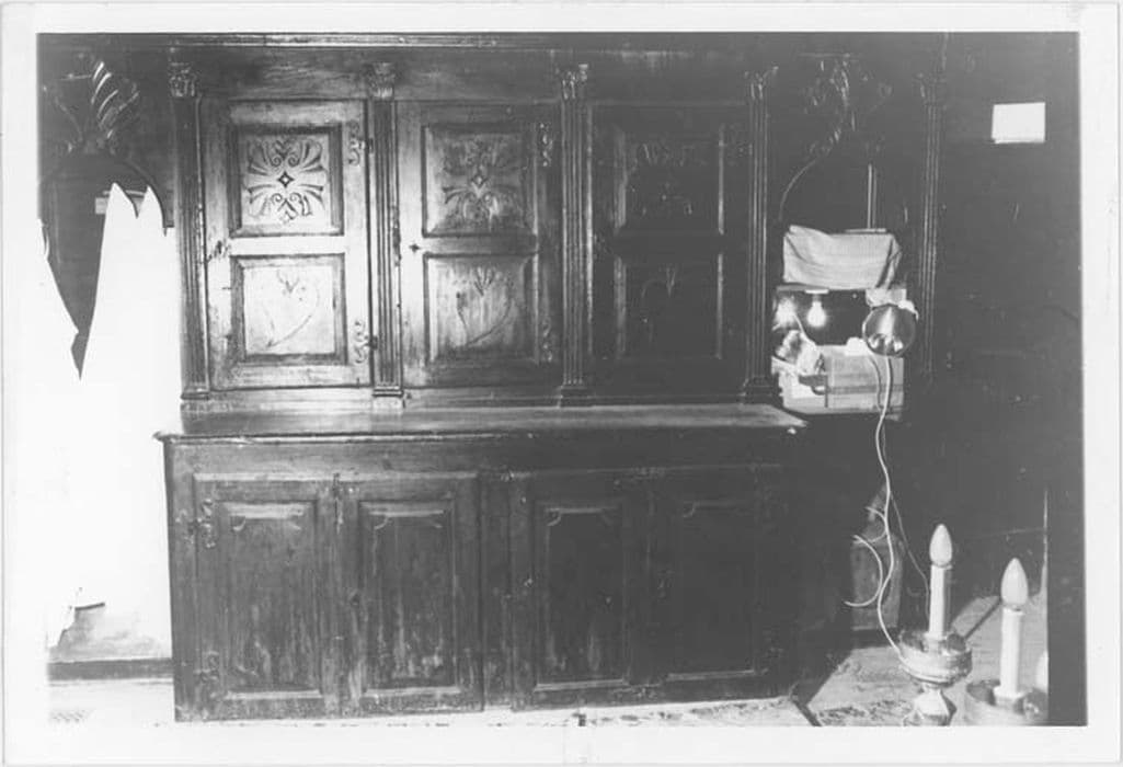 Il s'agit d'une armoire flanquée de deux placards. Décors végétaux stylisés, croix stylisées et coeurs ; pilastres cannelé à chapiteaux corinthiens.