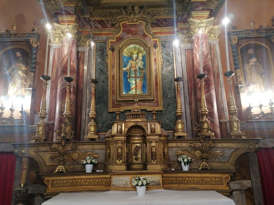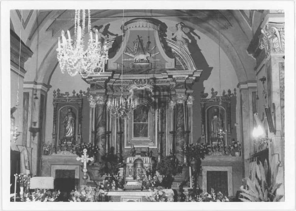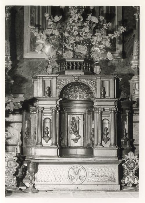 Autel surmonté d'un grand retable classique à colonnes, peintes en faux-marbre, entourant une petite niche et sommé d'un fronton à arc brisé et cartouche central représentant l'agneau pascal, en relief. Le retable est flanqué de deux niches à colonnes torses surmontant deux portes latérales d'accès à l'abside. Il présente trois niches occupées par la statue de la Vierge à l'Enfant en partie centrale, de saint Joseph et de saint Antoine abbé pour les parties latérales.