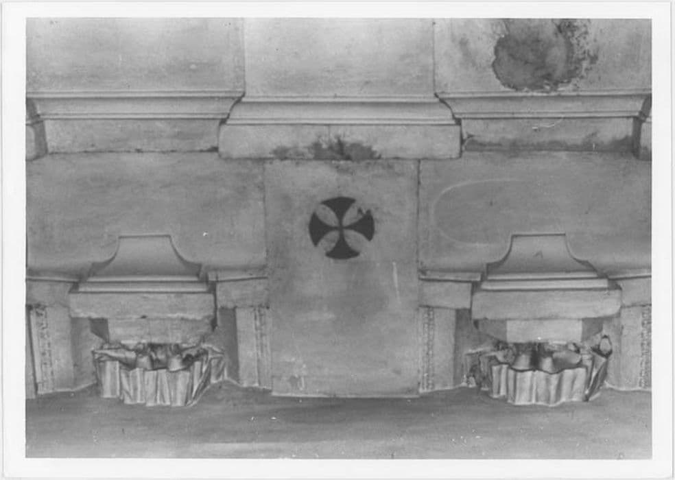 Quatre statues occupant le revers de la façade et qui ont été coupées par la construction de la tribune de l'orgue en 1791. Si la partie inférieure est conservée, la partie supérieure a eu à souffrir de décapitations systématiques à une date indéterminée.