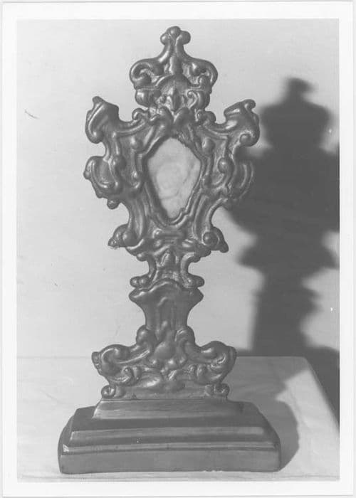 Reliquaire pédiculé décoré sur la seule face visible. Le pied est constitué d'un ensemble de volutes qui en compose la décoration. La monstrance est rhomboïde, avec angles arrondis et richement encadrée de volutes composant un décor de style rocaille surmonté d'un motif imitant une couronne.