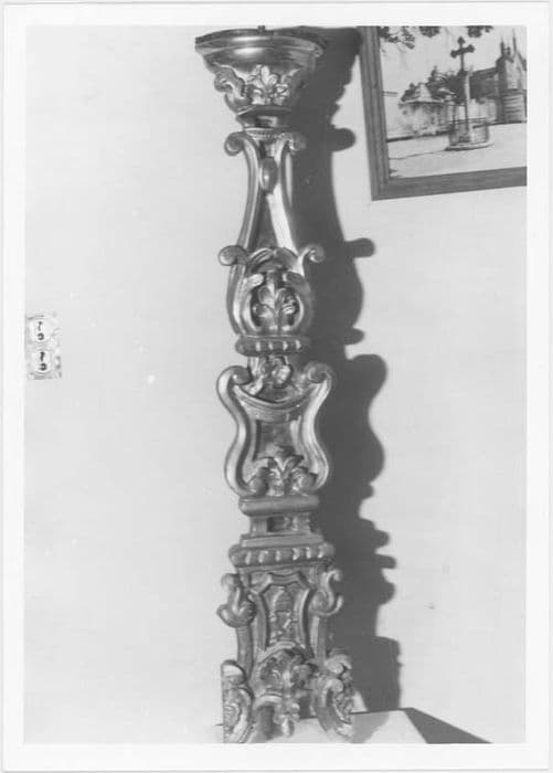 Chandelier tripode, à face décorée unique, avec décor ajouré sur fond de miroirs. Socle constitué d'un panneau porté et encadré de deux grosses volutes (malencontreusement amputées). Le noeud est pareillement constitué de volutes et le fût est en balustre.