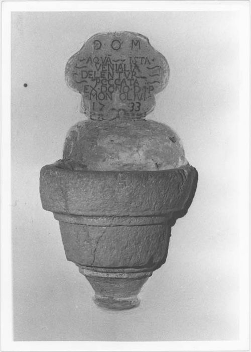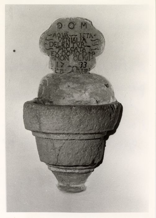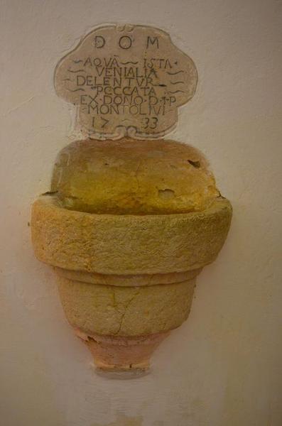 Bénitier composé d'une petite vasque encastrée dans le mur de volume conique et ornée de moulures la divisant en trois parties. Au-dessus, un cartouche présente une inscription en latin qui signifie : Cette eau efface les péchés véniels, don de P. Montolivi.