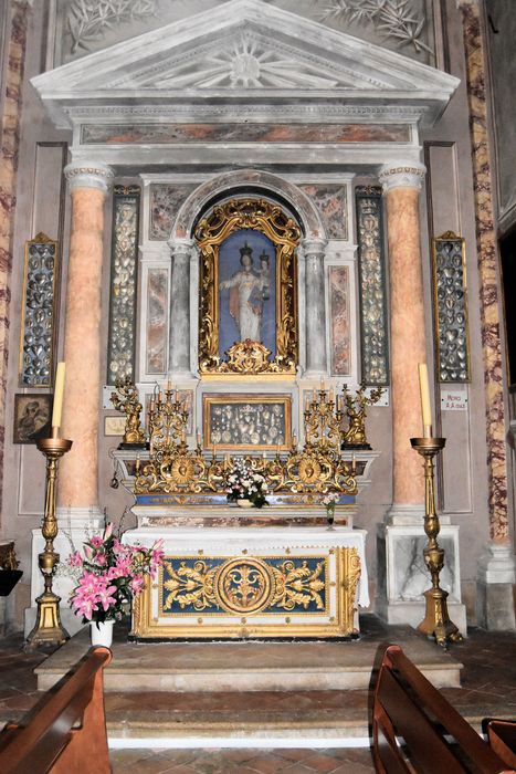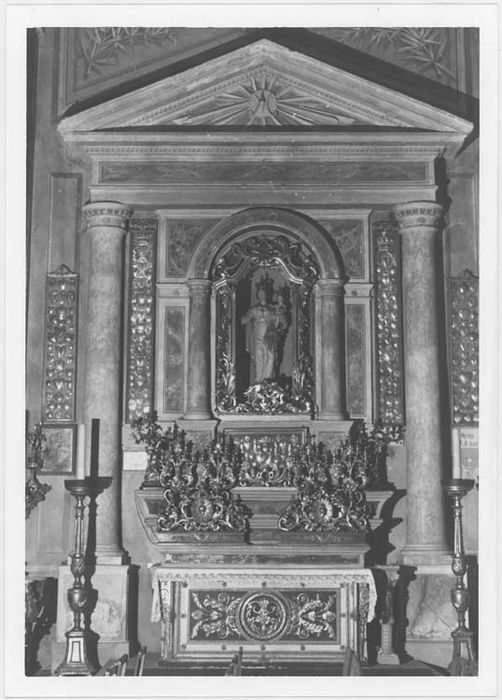 Autel surmonté de trois gradins encadré et surmonté d'un retable inachevé présentant des colonnes au fût cylindrique soutenant l'entablement et un fronton triangulaire. Autour de la niche centrale, deux colonnes engagées supportent un arc cintré.