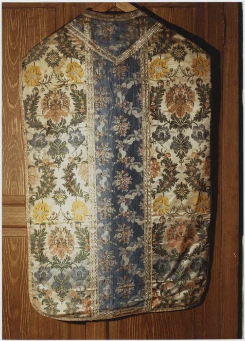 Chasuble composée de trois lés de tissu réunis avec galon argent. La bande centrale est en soie bleue brochée : motifs de petits bouquets et rubans dans les tons blanc et rouge. Les bandes latérales sont en soie blanche brochée de motifs végétaux stylisés : grosses fleurs (style 18e).
