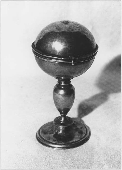 Ciboire de poche de taille réduite. Pied circulaire, noeud en balustre et couvercle en coupole.