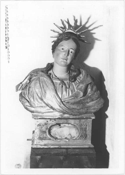 Il s'agit du buste-reliquaire de sainte Fortunée. Elle est représentée comme une jeune femme aux cheveux ondulés couronnée d'une auréole. Elle porte une tunique.